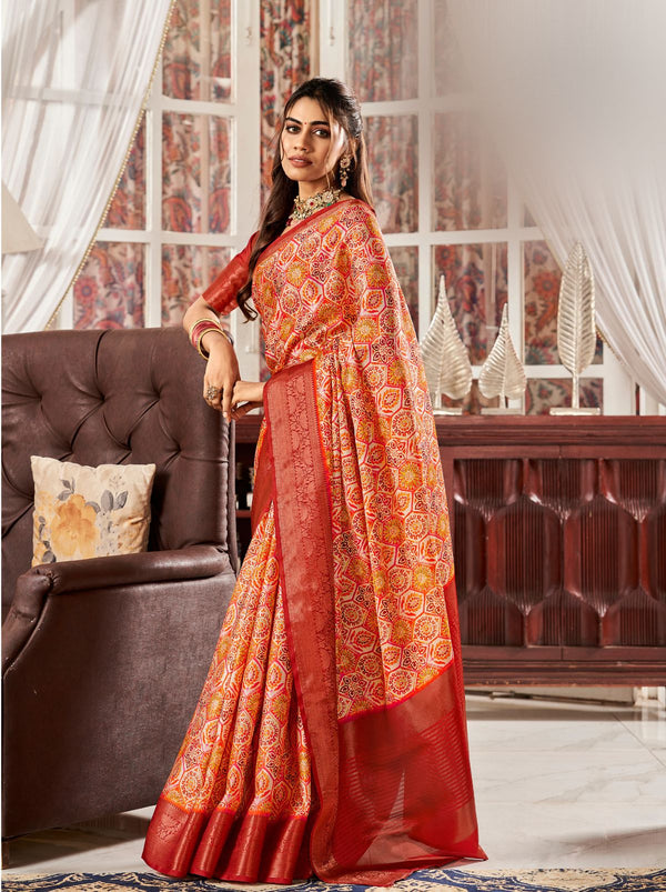 • Charm It With Red Trendoye Saree with Unstitched Blouse Fabric: This playful printed saree is sure to put a smile on her face.
